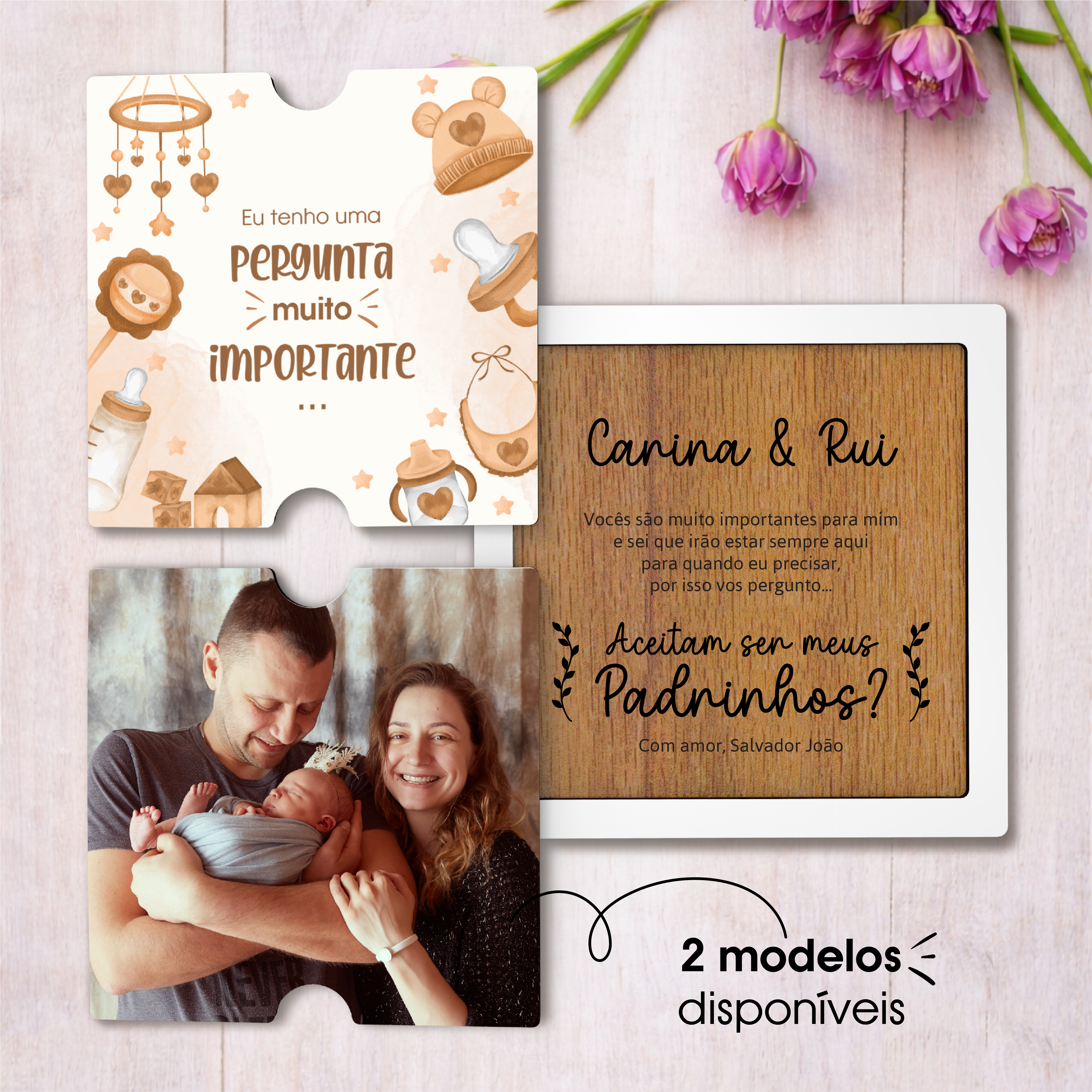 Ideal para surpreender futuros padrinhos ou madrinhas, este convite destaca-se pelo cuidado nos detalhes e pela emoção que transmite. Pode personalizar com o nome da criança, uma mensagem especial e até uma fotografia que torne o convite verdadeiramente único.